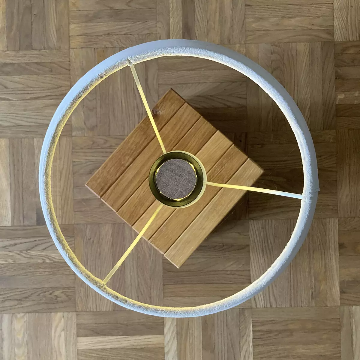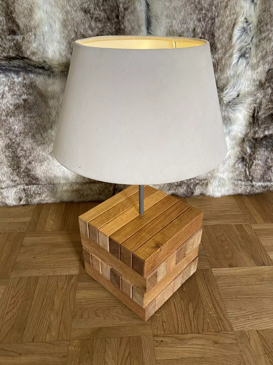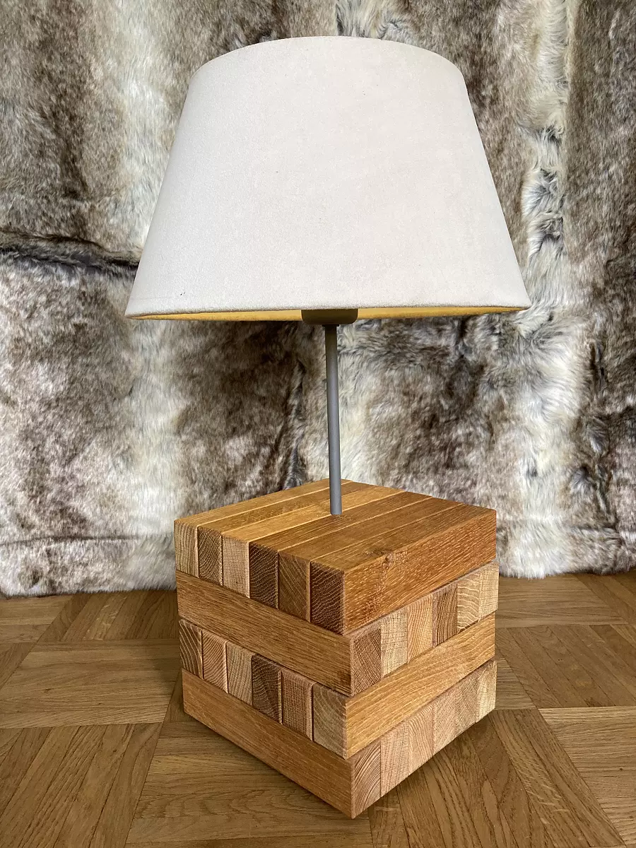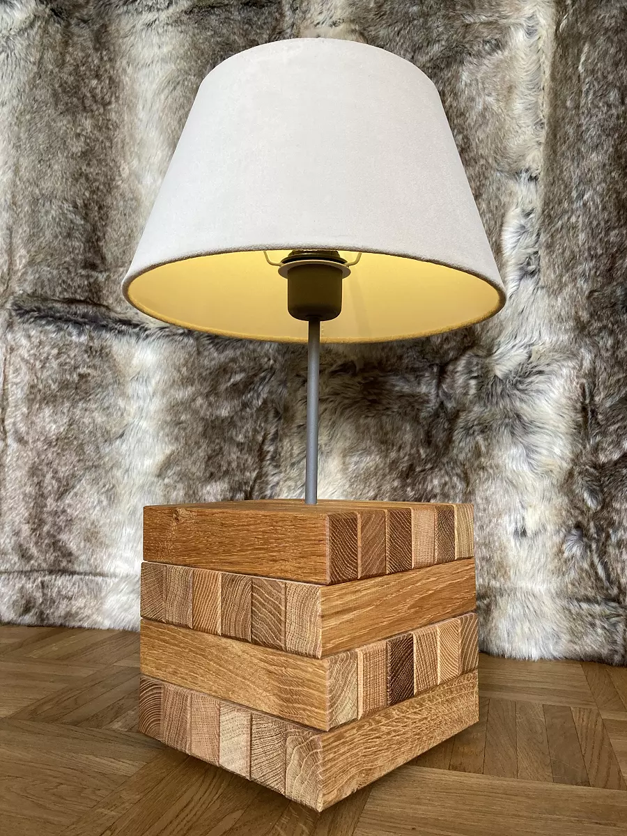 Eine wunderschöne Tischlampe mit 6 × 4 geölten Eiche und Esche Klötzchen, samtiger Schirm, Korkfüßen, LED Leuchtmittel mit Batteriefach für dreimal 1,5 Volt AA-Batterien oder Akkus (nicht inklusive).