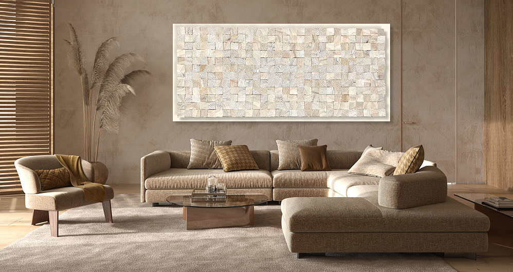 Jedes Element des Bildes ist ein Unikat, das die natürliche Maserung des Holzes in den Vordergrund stellt und gleichzeitig moderne Designprinzipien verkörpert. Der Kontrast zwischen den warmen Holztönen und dem eleganten weißem Rahmen sorgt für eine eindrucksvolle visuelle Tiefe, die jeden Raum aufwertet.